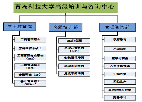 中心目前已形成三大板块:学历教育部、高级培训部和管理咨询部。其中学历教育部包括:工商管理硕士、应用经济学硕士、工商管理专业硕士(MBA)、会计专业硕士(MPAcc)、工程管理专业硕士(MEM)、金融专业硕士(MF)专业硕士;高级培训部包括:MBA特色班,企业高管培训、金融银行培训、企业基础培训、党政干部培训5个基本模块;同时依托H视频 及国内前三咨询机构成立管理咨询部,能够提供政府咨询、产业规划、企业上市、国央企市值管理、人力资源管理、精益生产、财务管理、工程咨询等方面的咨询服务。
